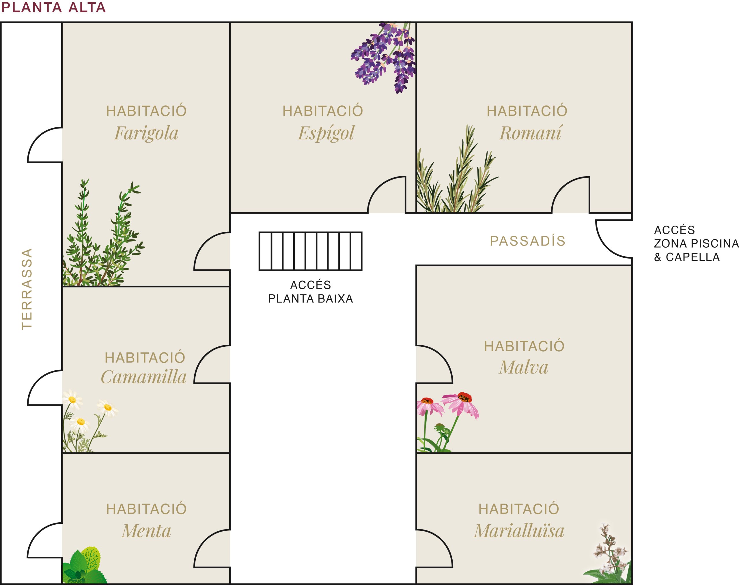 Farigola: 1 llit d’1,80 m + 2 llits de 0,90 m.